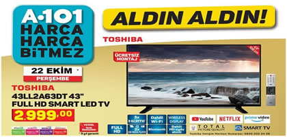 A101 Market 22 Ekim 2020 Aktuel Urunler Katalogu Yayinlandi A101 De Bu Hafta Teknoloji Indirimleri Neler Teknogaste : 22 Ekim A101 Aktüel Ürünler Kampanyasında Haftanın Fırsatı Olarak Yer Alan Toshiba 49Ll2A63Dt 49 Full Hd Smart Led Tv Için 2.999 Tl Fiyat Görüyoruz.